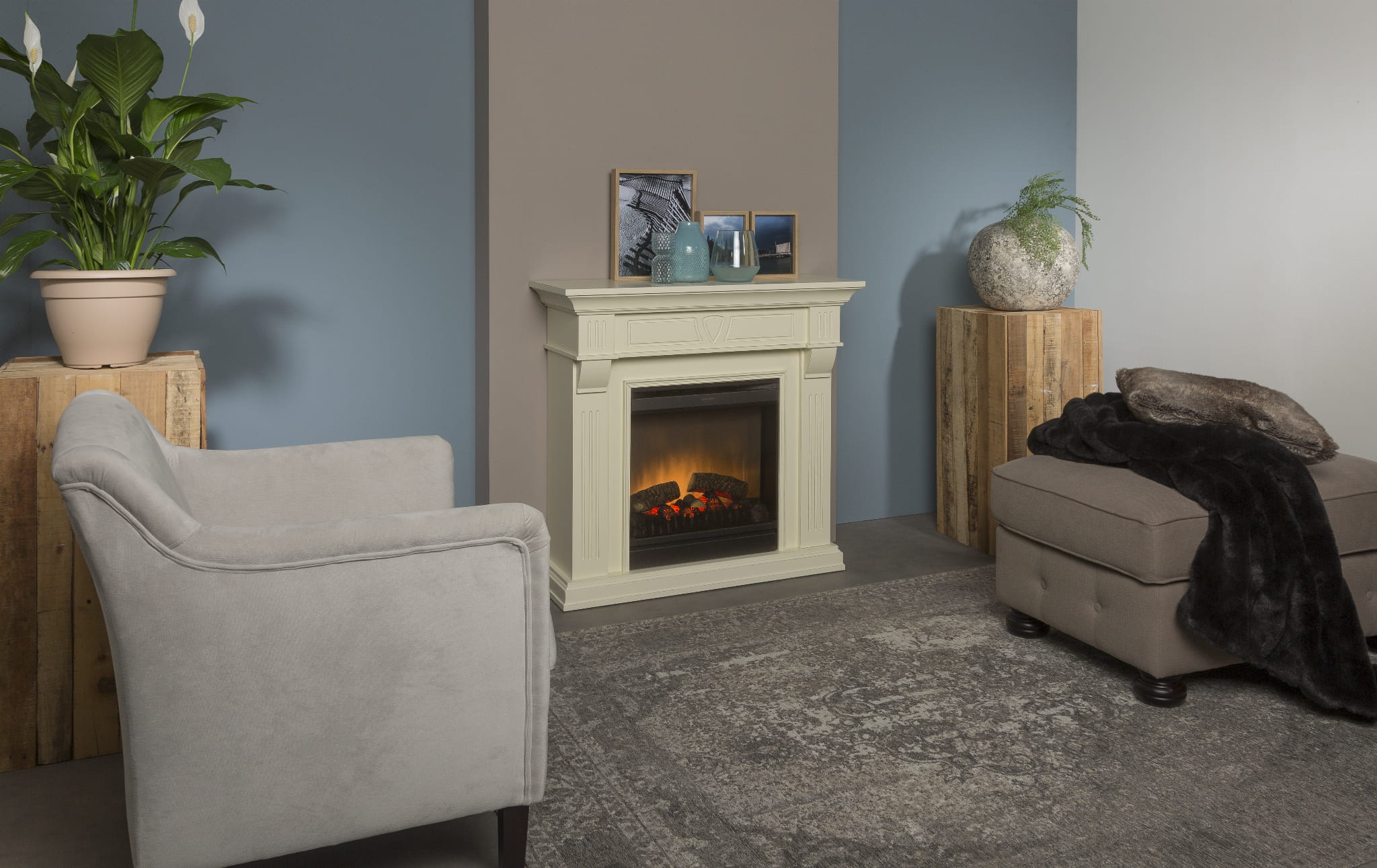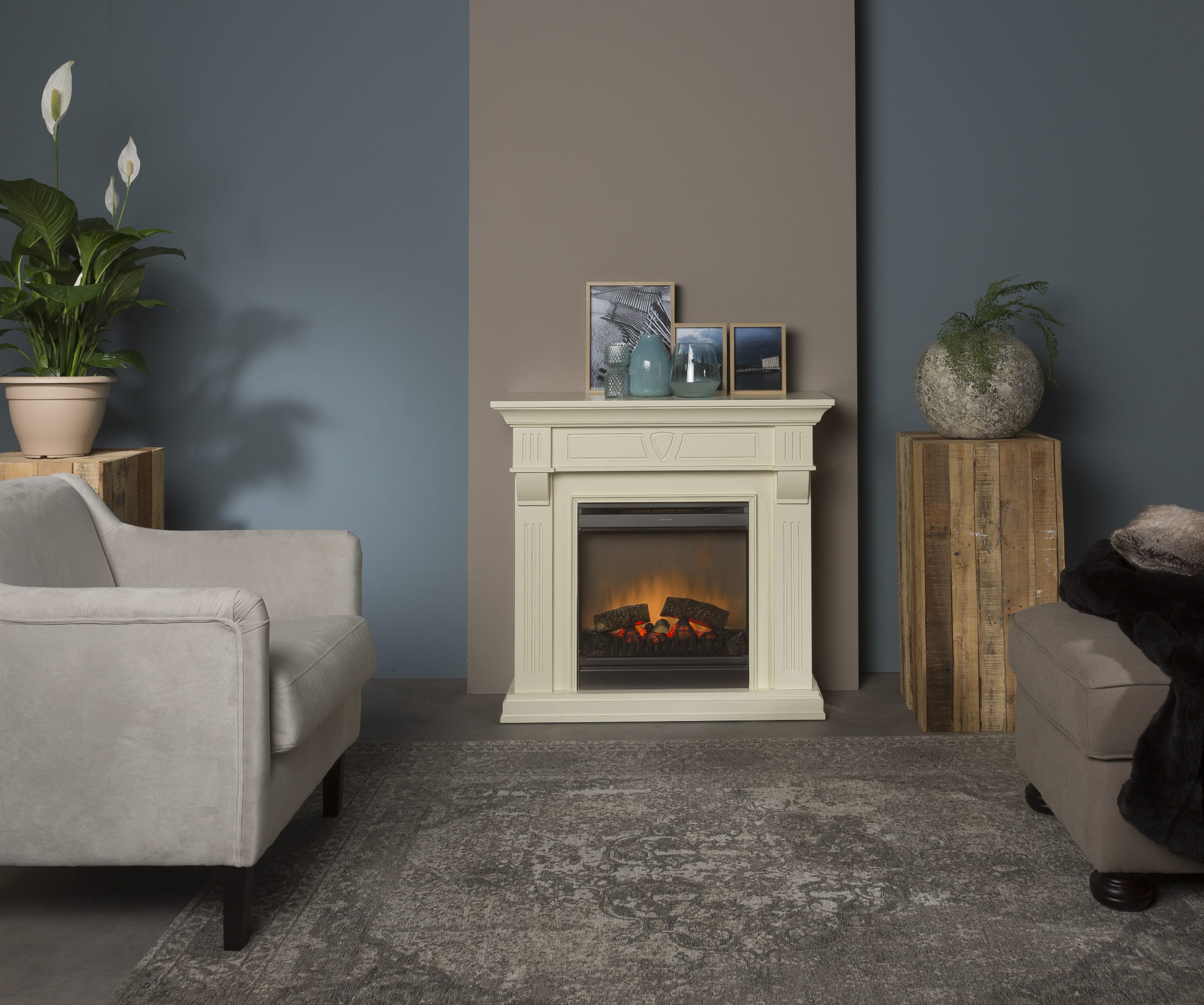 Elegancki, klasyczny kominek bazujący na wkładzie kominkowym 20" z obudową w kolorze kremowej bieli. Można go ustawić bezpośrednio przy ścianie jak i w narożniku pomieszczenia. Posiada palenisko z płonącymi polanami. Dla zobrazowania płomieni zastosowano w nim technologię optiflame. Sterowanie przy pomocy dołączonego pilota zapewnia wysoki komfort obsługi. Kominek wyposażony jest w kabel zasilający z wtyczką.