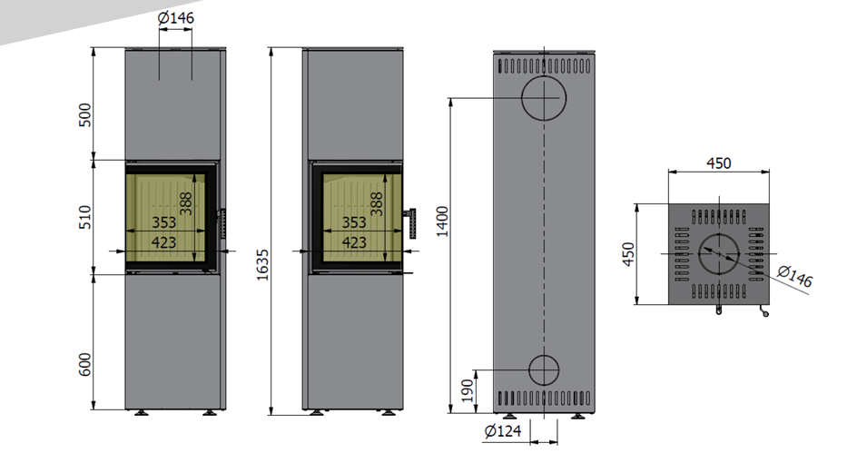 - Średnica króćca wylotu spalin: ø150 mm