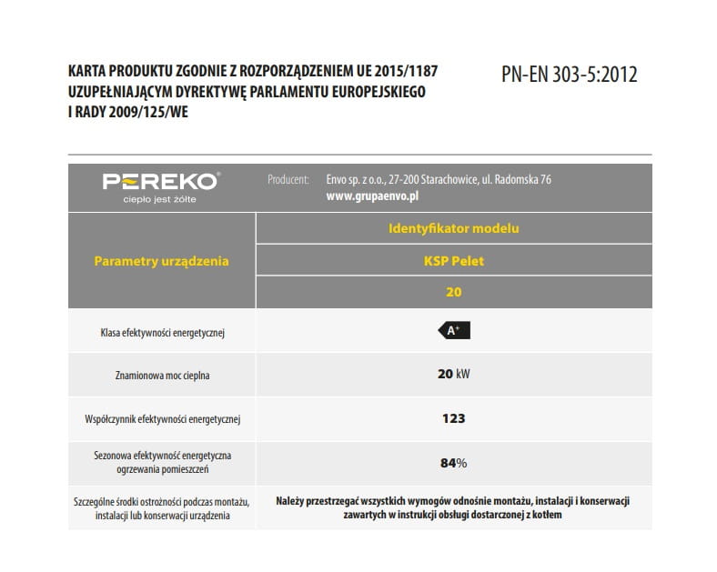 Piec PEREKO KSP Pelet to projekt ekologiczny, który jest przyjazny środowisku naturalnemu, spalającemu wyłącznie pellet. Dla modelu 20 kW przyznana została najwyższa, 5 klasa emisji spalin